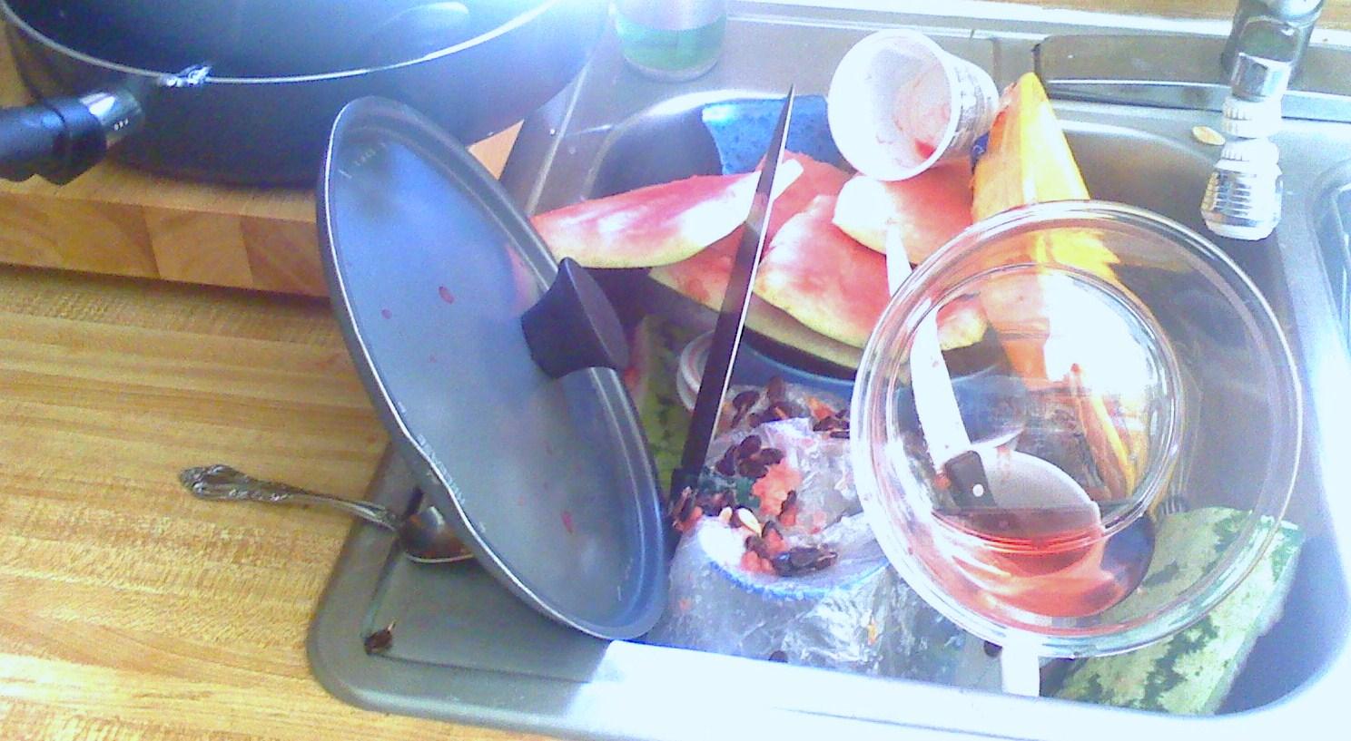 I do the cooking in our house because I enjoy cooking and my wife does not. I usually make huge messes when I cook: countertops flecked with flour and fruit juice and butter, stove top smoking with burned on spills, a sink overflowing onto the large cutting board with stacks of dirty pots and pans.