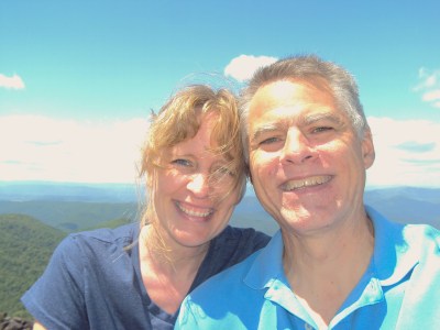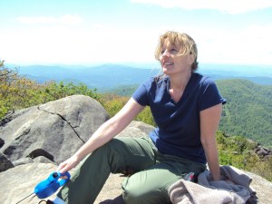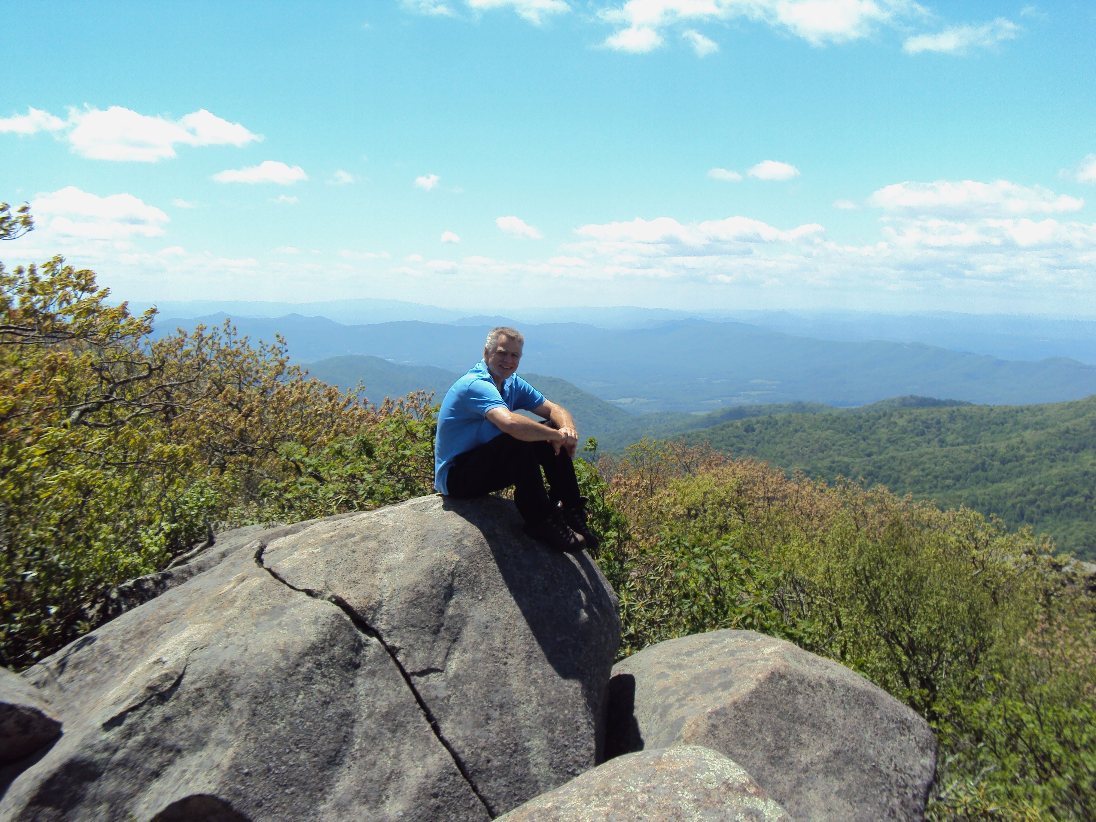 The Peaks of Otter is “Our Place,” where I asked Kimberly to marry me February 14, 2007 on Sharp Top Mountain.  As many times as we have been there, we have never hiked up Flat Top until last Thursday.  Our creaky joints and straining muscles reminded us of our age as we climbed the fairly steep 2 mile trail up, but we finally made it.  You will notice the blue plastic retractable leash in most pictures as the one holding the camera could not hold the dog.
