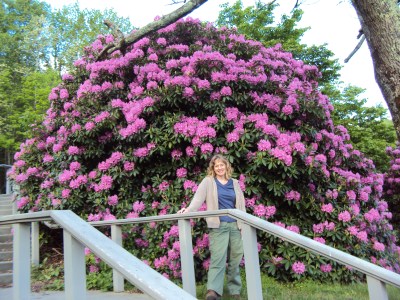 To celebrate our fifth year anniversary (May 10), Kimberly and I took advantage of her sister Kristen’s gift to eat at Peaks of Otter restaurant overlooking the lovely lake and we hiked up Flat Top Mountain with Mazie.  The weather was perfect and everything was dressed in fresh green.  Though the rhododendron had not started to bloom on the mountains, down at the lodge they were bursting out with abandon… more like a tree than a shrub!