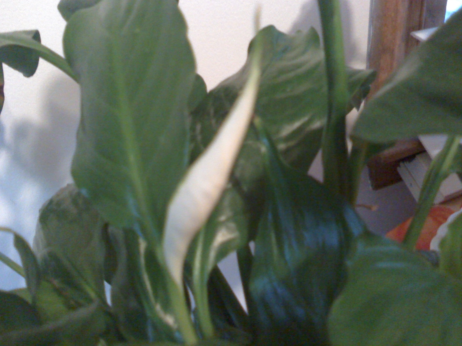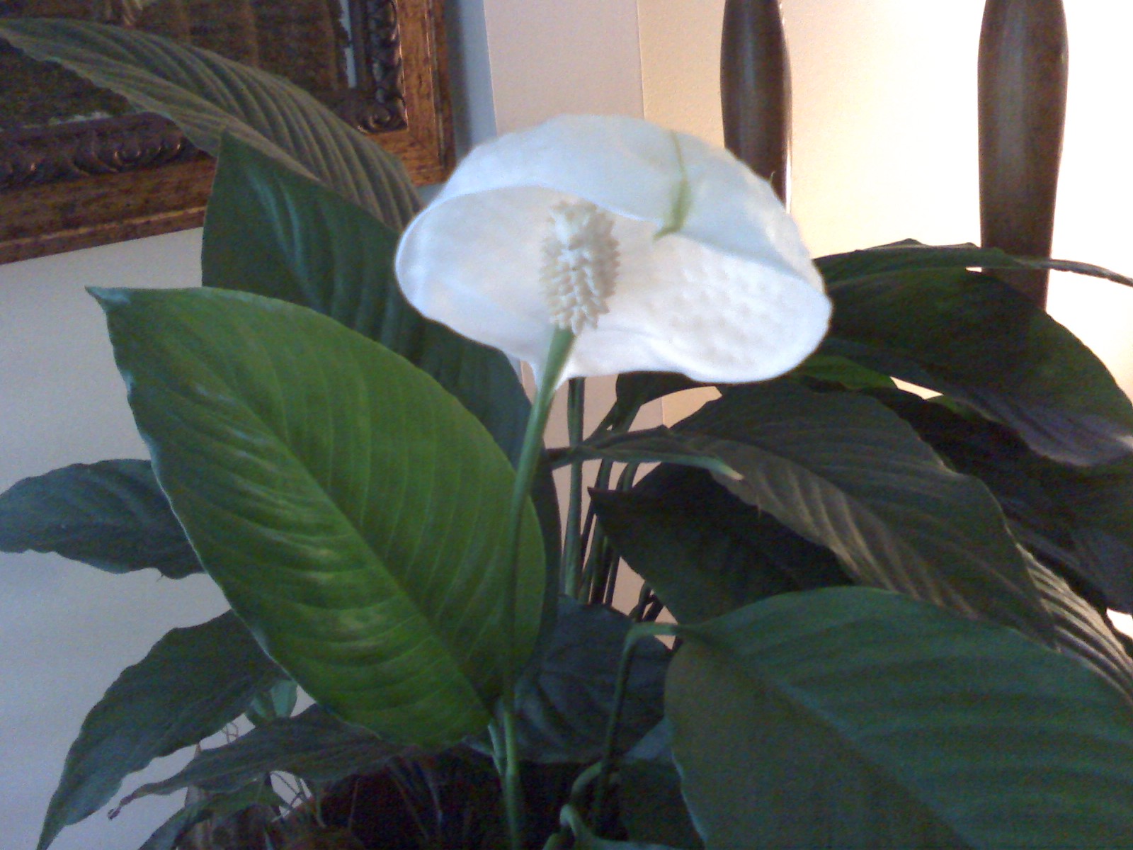 About 10 years ago my oldest sister Mardi gave me a peace plant from her home. For the first couple of years it had several blooms, but with my haphazard watering and giving it sunlight, it soon stopped blossoming. When it drooped, I would water it… if I were around and noticed. I think it has more roots than dirt since I have never repotted it, not wanting it to get bigger. A less hardy plant would have just given up (as many of mine have!), but this one persevered. It put out nice green leaves, usually with brown shriveled tips from over-watering or under-watering (I still can’t tell the difference).