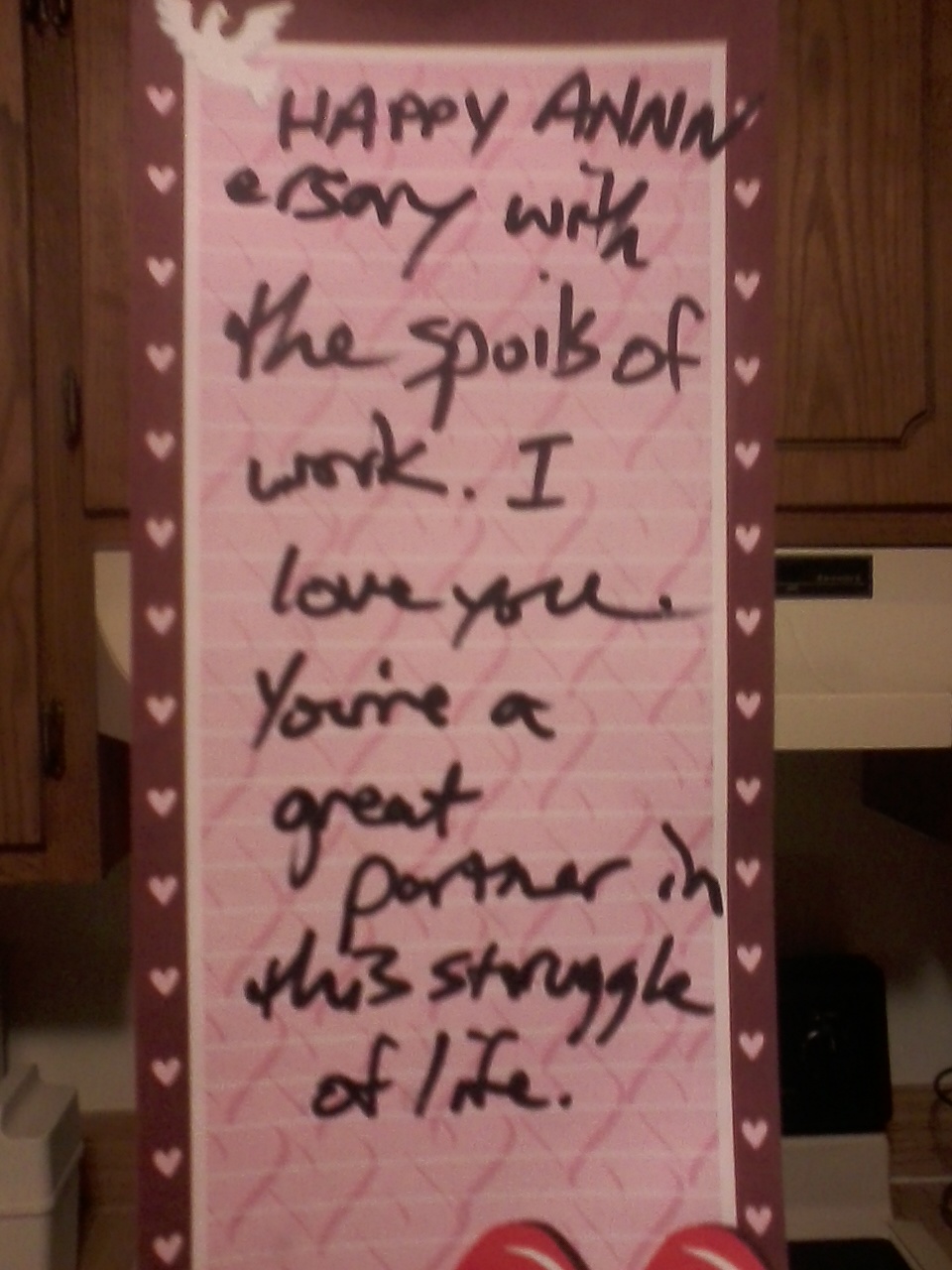 It’s our anniversary today. Last year I went “whole hog” as my mother would say: an 8 foot card of all Kimberly’s attributes. This year things have gone the other direction–pork rinds so to speak. We’re both tired, worn down, stumbling through our days clinging to linty scraps of hope that we keep misplacing. My offering in celebration of 7 years of marriage was a handful of dry, leftover brownies I brought home from work and a love note scribbled on a slip of paper from our refrigerator grocery list pad. I left that for her to discover this morning when she got up.