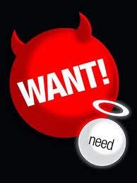 I think our distinction between need and want slowly worked itself into a spectrum represented at one end by absolute necessity (what we need to survive) and at the other end by mild wishes. We tend to assign “needs” an objective value (actual need) and “wants” a subjective value (just a feeling) and to downplay our desires. No matter how intense your feelings, I will judge them as only a “want” if they do not pass the objective test for “needs.” My attitude will be “get a grip!”